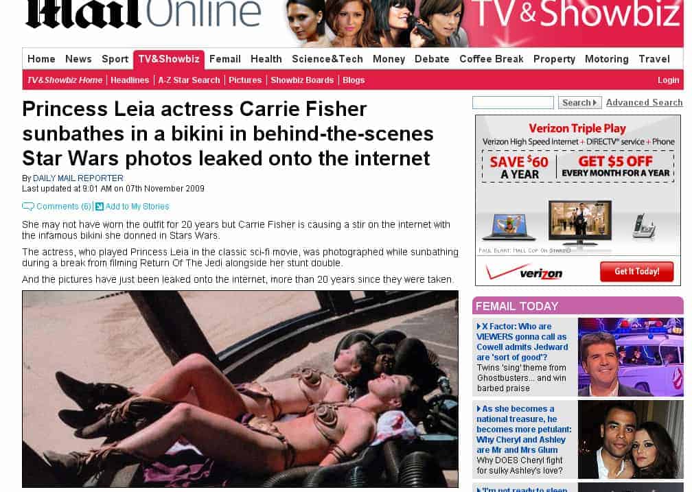 Oh, I’m sure you saw that photo. It was tearing up the internets this past week: the snapshot of Carrie Fisher, in Princess Leia metal bikini-wear, sunbathing with her identically clad stunt double while on set in Arizona for Return of the Jedi.